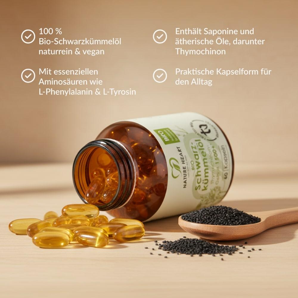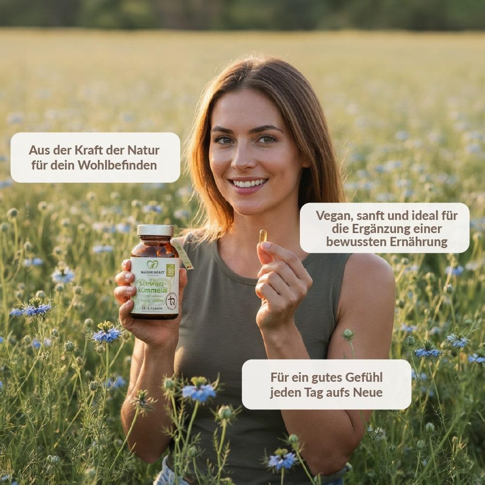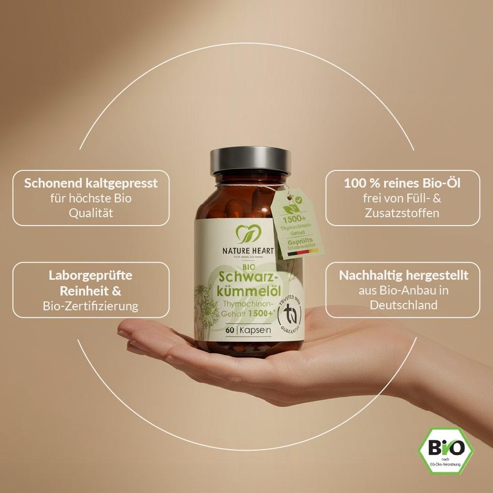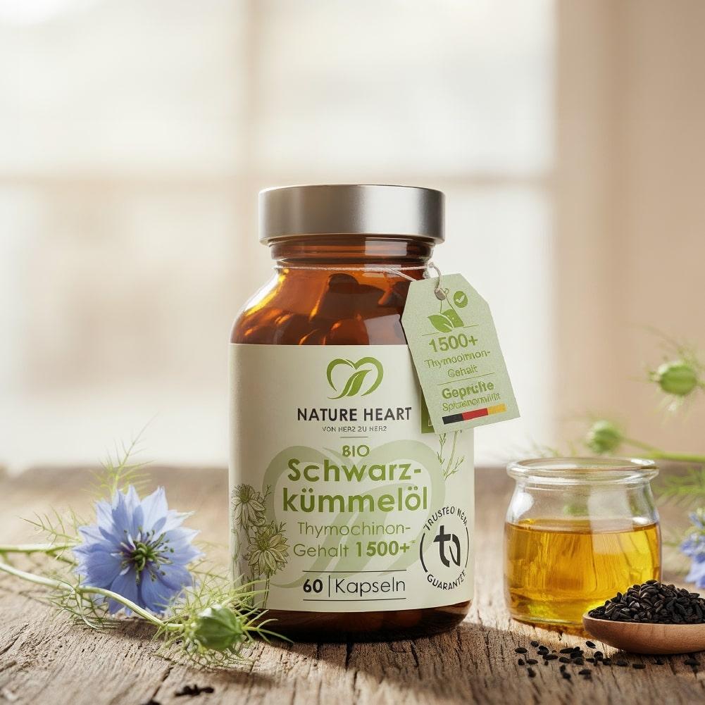Das Schwarzkümmelöl von Nature Heart wird in einem speziellen Herstellungsverfahren durch Kaltpressung gewonnen, damit alle wertvollen Inhaltsstoffe erhalten bleiben. Bei der Herstellung der Nature Heart Schwarzkümmel-Öl Kapseln wird komplett auf unerwünschte Zusatzstoffe und Füllstoffe verzichtet. Maximale Reinheit – für ein gutes Gefühl Tag für Tag.