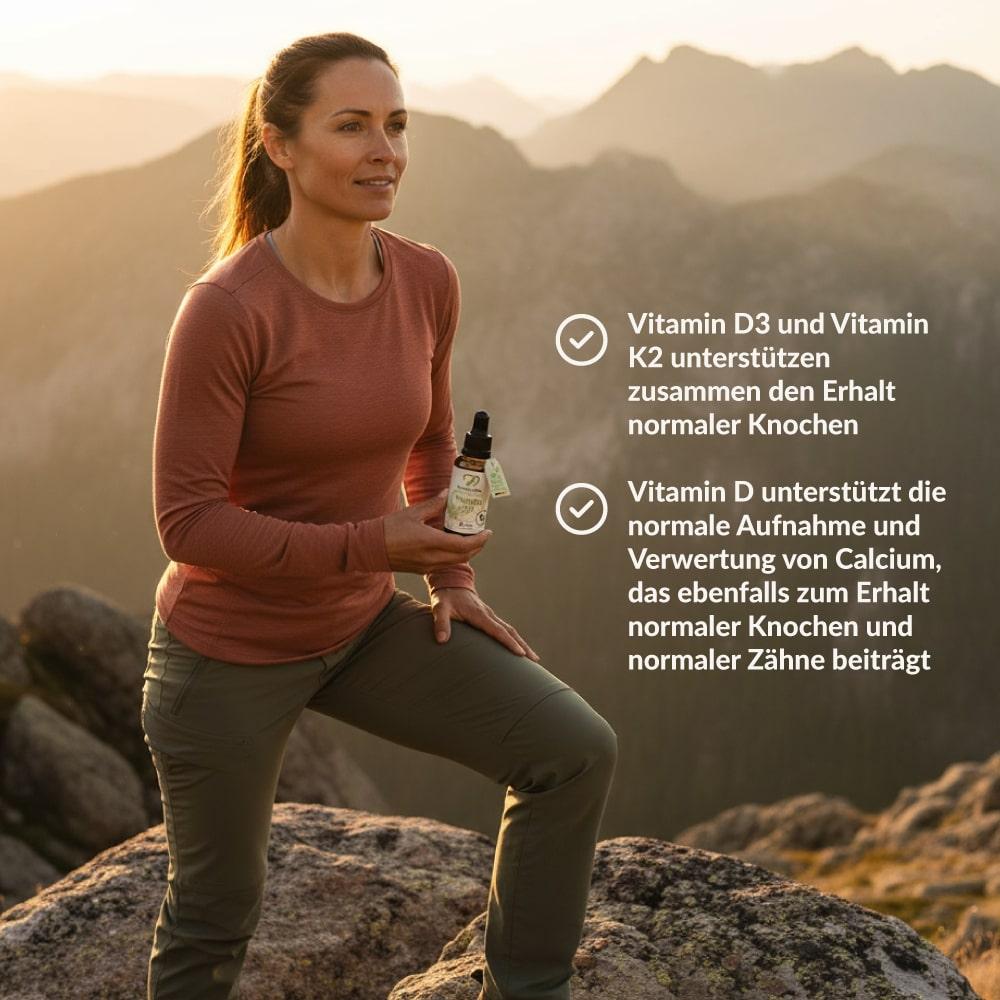 Das Kombiprodukt Vitamin D3-K2 vereint somit die ganze Kraft für starke Knochen.
