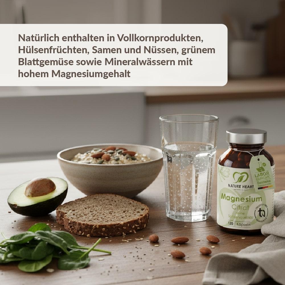 Magnesium ist in vielen Lebensmitteln enthalten. Besonders magnesiumreich sind Vollkornprodukte, Hülsenfrüchte, Samen und Nüssen, grünes Blattgemüse sowie Mineralwässer mit hohem Magnesiumgehalt.