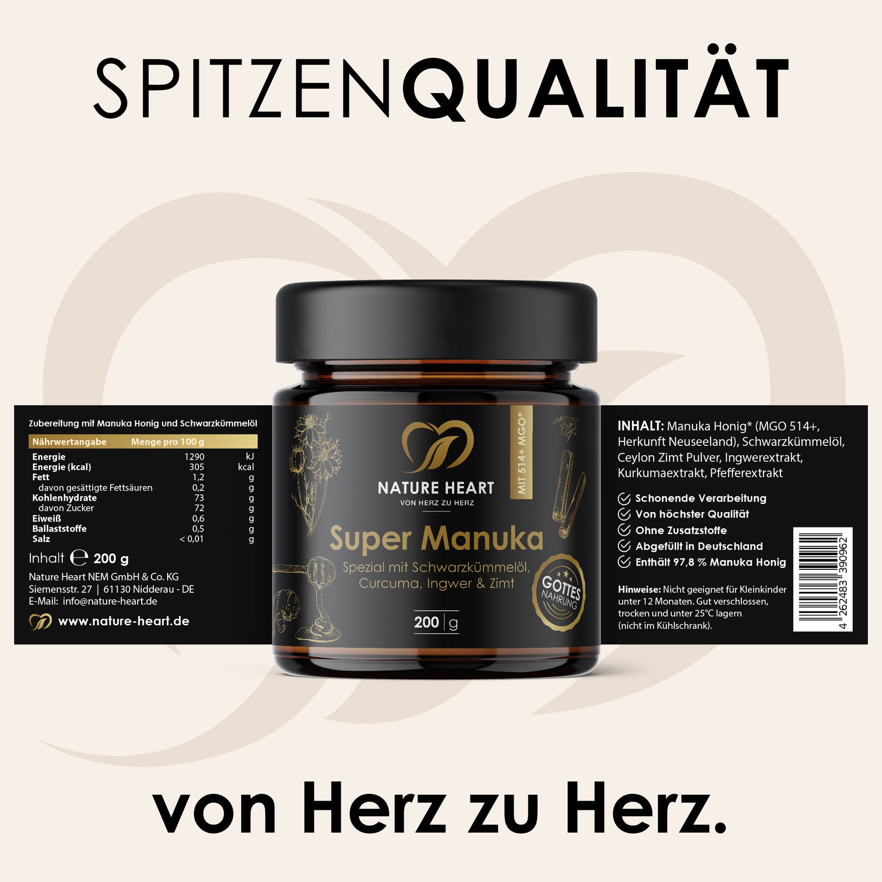 Nature Heart Super Manuka Honig 514+ MGO mit Schwarzkümmelöl vereint die besondere Qualität neuseeländischen Manuka Honigs mit ausgewählten, aromatischen Zutaten. Die Kombination aus Manuka Honig, Schwarzkümmelöl, Ceylon Zimt, Ingwer-, Kurkuma- und Pfefferextrakt schafft ein einzigartiges Geschmacksprofil – intensiv, harmonisch und vielseitig einsetzbar.